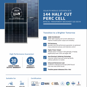 Shakti Solar PE-144 HC PERC Bifacial Module (525Wp – 555Wp) is a high-performance bifacial solar panel designed with PERC half-cut cell technology and transparent back sheet. It delivers excellent power output, higher efficiency, and long-term durability, making it suitable for rooftop and utility-scale solar projects